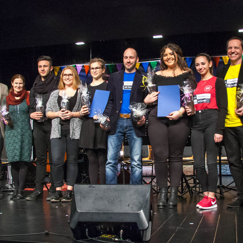 Alfred-Wegener Schule Kirchhain – „Darstellendes Spiel“ Unter dem Titel „Wohin würdest du gehen?“ hat das rund 50-köpfige Ensemble die renommierte Fachjury der Kasseler Musiktage mit einer selbst erarbeiteten Inszenierung beeindrucken und überzeugen können (zum MK-Bericht, Interview und Live-Mitschnitt der Aufführung). Mit diesem spannenden Projekt betraten alle Beteiligten Neuland, da erstmalig eine Zusammenarbeit mit einer Gruppe jugendlicher Geflüchteter der BSK-Kirchhain stattfand. Neben dem Wettbewerbspreis gewannen die Schülerinnen und Schüler auch noch den begehrten Publikumspreis.